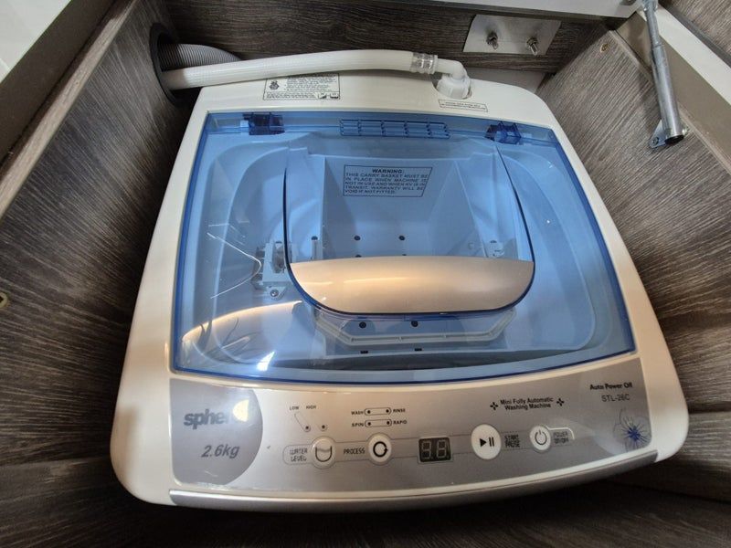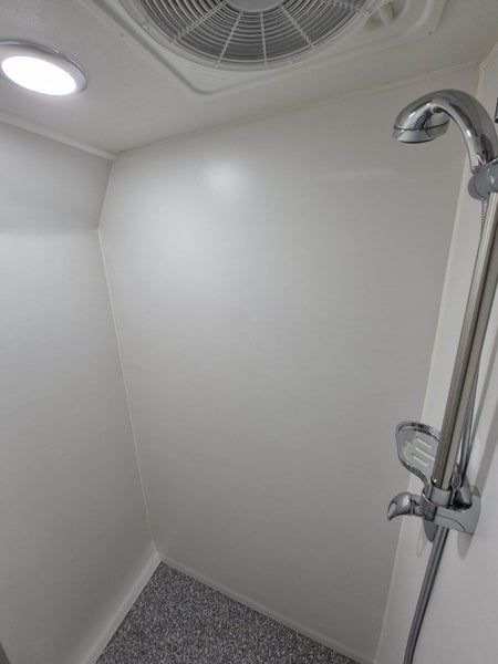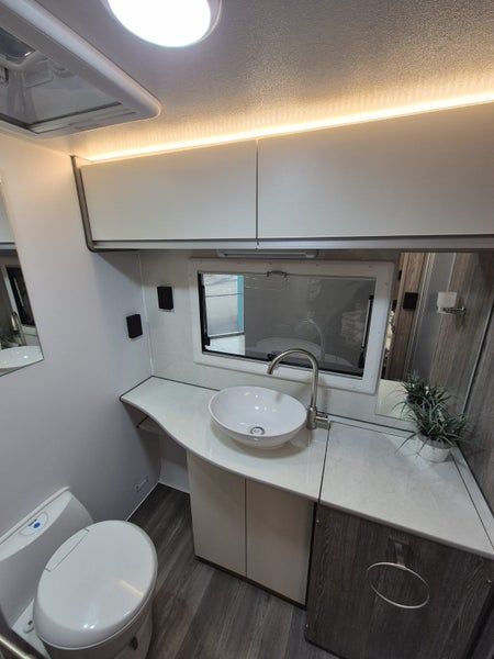 Rear spacious bathroom with separate shower, cassette toilet, vanity, cupboards plus a washing machine