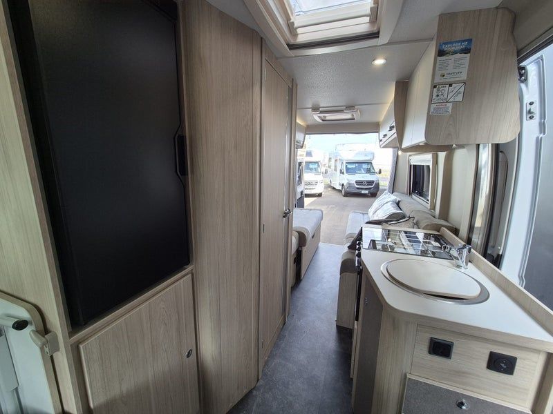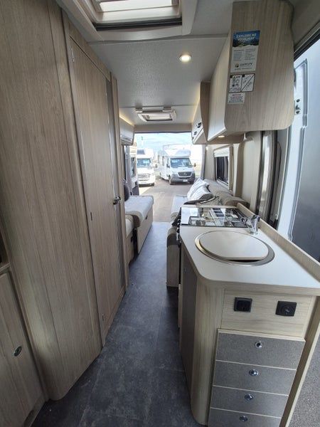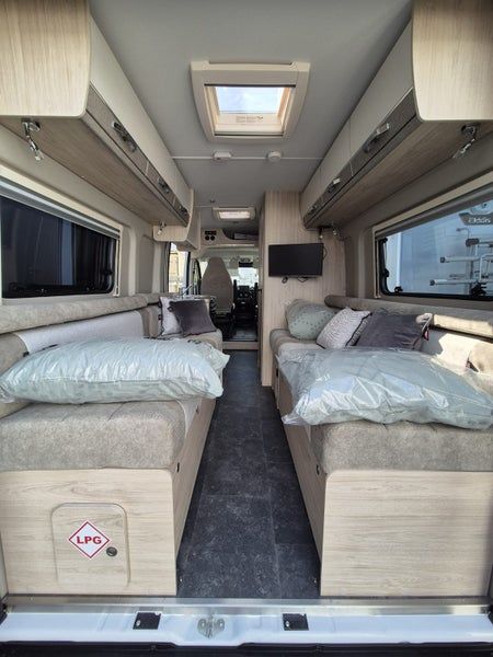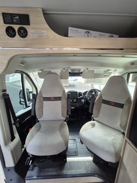 The 2025 Elddis Autoquest CV20 is a two-berth, two-seatbelt campervan on a Fiat Ducato base vehicle, featuring twin singles that double as couches, a practical kitchen and washroom