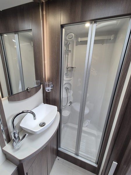 Bathroom: Full-width rear washroom with a separate shower cubicle