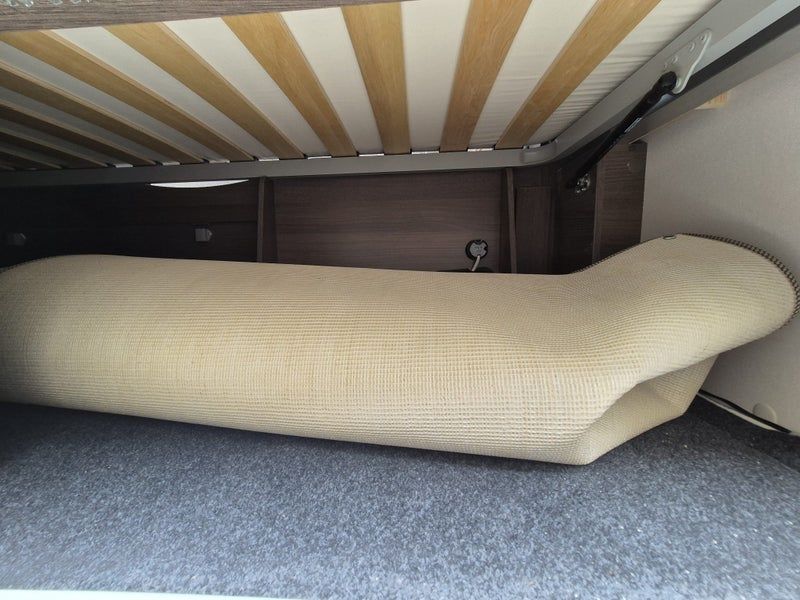 The Encore 285 is built using Elddis SoLiD construction method. In short, the aluminium composite walls, roof, and floor are all bonded together using Henkel sealants. Keyway joints are used in preference to screws and rivets, the idea being to maximise the overall body strength and minimise water ingress. To keep water out below floor level, a GRP (fibreglass) skin covers the underside.