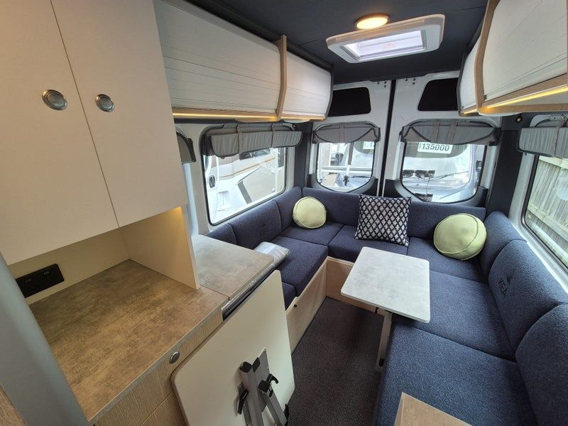 Featuring a fold out 6 foot single bed at the front and a U-Shaped Lounge at the rear which transforms into a N/S King, east west double bed or 2x1.9m singles
