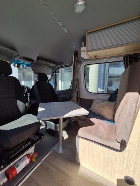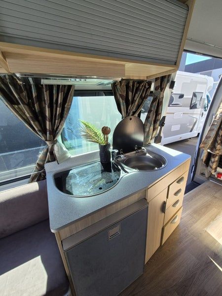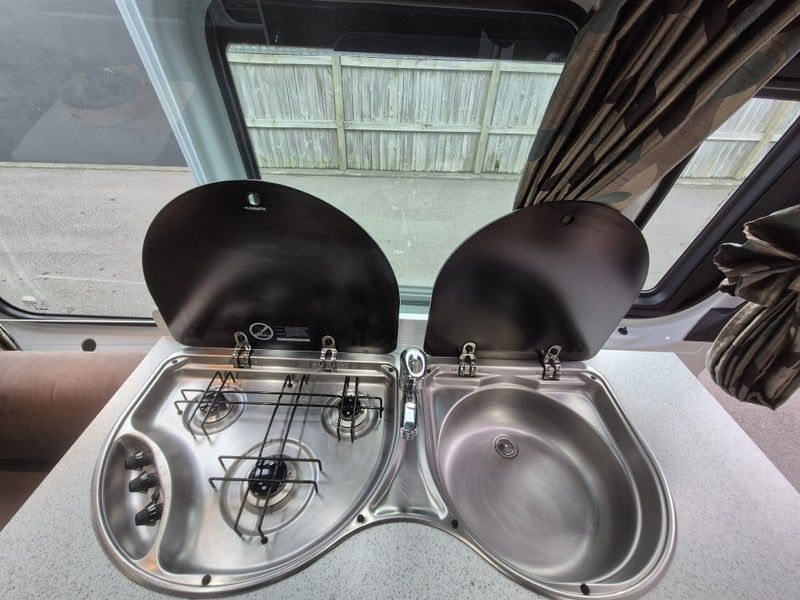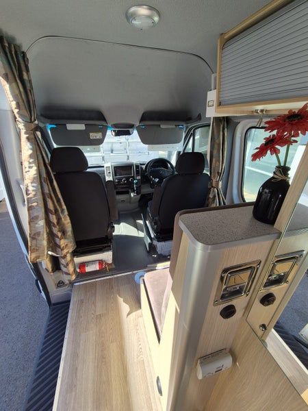 Kingquest Auto Sat Dome, Fiamma roll out Awning, 12v sockets above passenger seat, shelf for modem, tap connection above sink etc